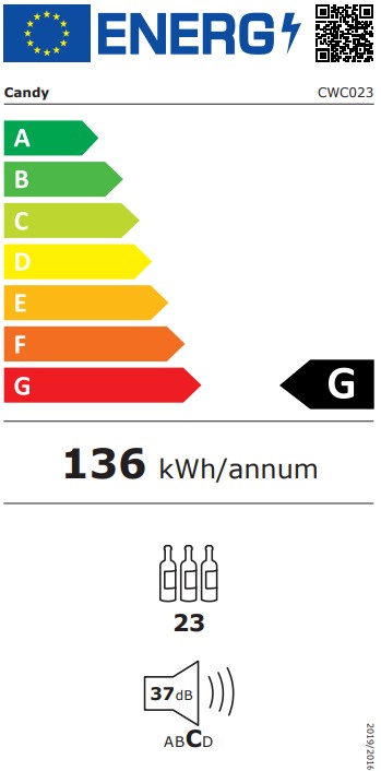 Zgodnie z nową etykietą energetyczną, chłodziarka na wino Candy posiada klasę energetyczną G.