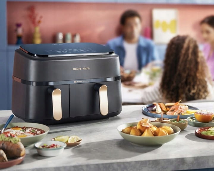 Frytownica na gorące powietrze Dual Basket sprzyja oszczędzaniu i zużywa o 70% mniej energii niż standardowy piekarnik.