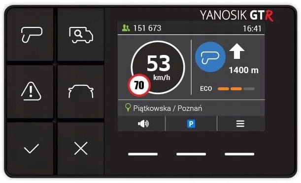 Yanosik to społeczność ponad 1,5 mln kierowców miesięcznie. Nowe zgłoszenie pojawia się w systemie średnio co 3 sekundy. Z urządzeniem Yanosik GTR dostajesz informację o każdej nieoczekiwanej sytuacji na trasie, na której się znajdujesz: kontroli, pracach drogowych, wypadkach. Gdy zbliżysz się do kontroli prędkości za pomocą fotoradaru, system poinformuje Cię o obowiązującym na danym odcinku ograniczeniu. Po zakończonej jeździe otrzymasz jej podsumowanie – liczbę przejechanych kilometrów, czas, średnią prędkość czy liczbę wydarzeń zarejestrowanych w systemie Yanosik.