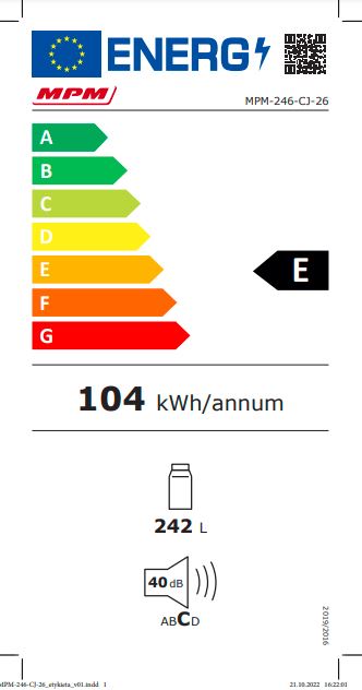 Chłodziarka MPM-246-CJ-25 pracuje w klasie energetycznej E , pozwalając ograniczyć zużycie energii do 104 kWh w skali roku.
