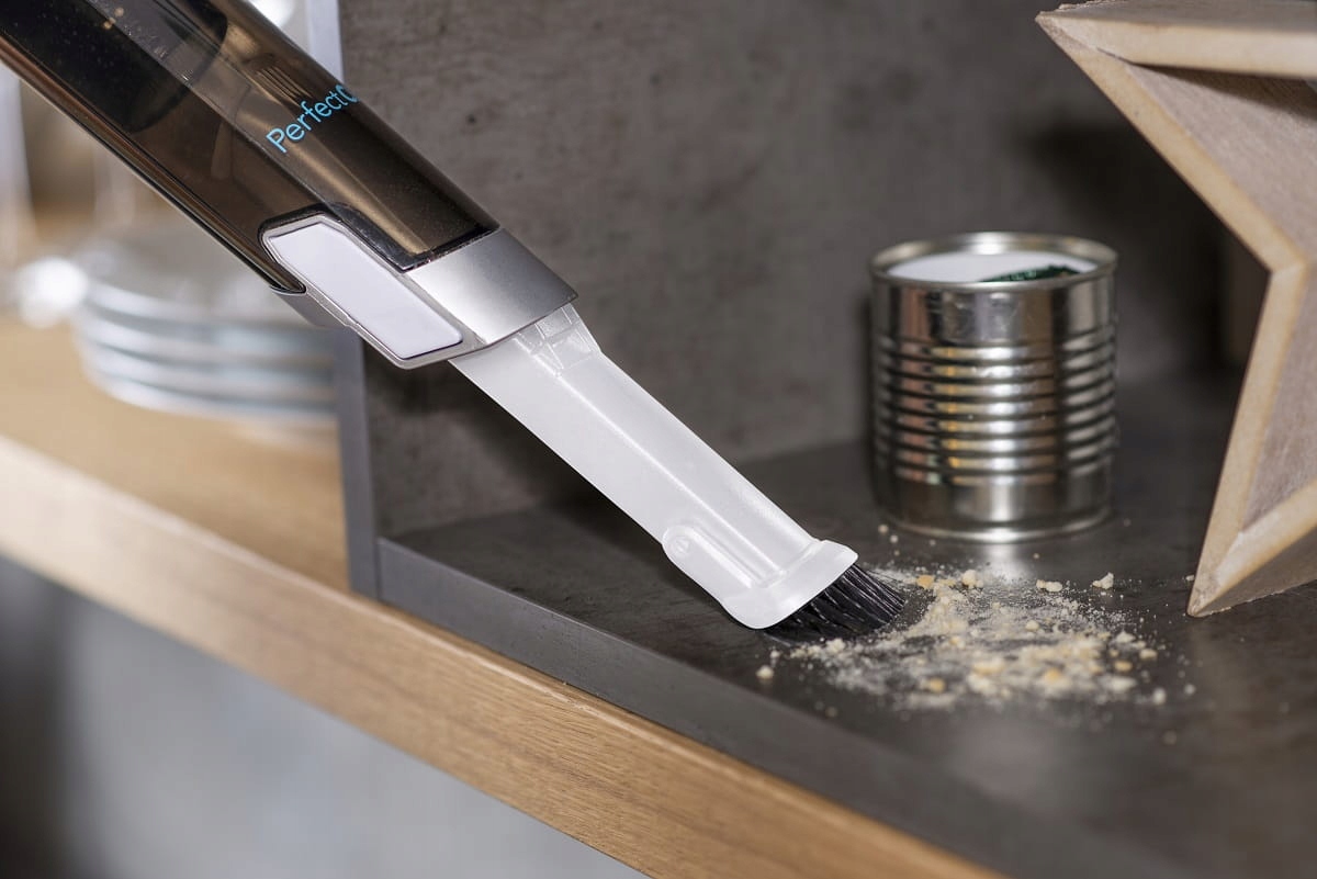 W wyposażeniu odkurzacza ręcznego VP4420 znajdziesz specjalną nasadkę 2 w 1, która jest połączeniem nasadki szczelinowej i szczotki do kurzu. Możesz użyć jej jako oddzielnej ssawki szczelinowej do odkurzania trudno dostępnych miejsc (grzejniki, szuflady, przestrzenie między materacami a tapicerką itp.) lub zamknąć szczotkę do kurzu i delikatnie odkurzyć meble, rolety, parapety, książki lub klawiaturę.