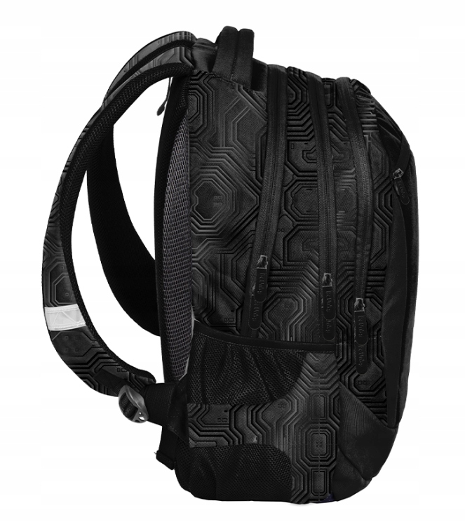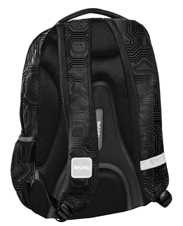 Plecak młodzieżowy Cyberhack od BeUniq to doskonały wybór dla młodzieży. Wyposażony w trzy pojemne komory oraz praktyczną kieszeń przednią z organizerem, zamykaną na zamek, zapewnia wystarczająco dużo miejsca na wszystkie niezbędne rzeczy. Dwie boczne kieszenie, wykonane z siatki i materiału, idealnie nadają się do przenoszenia butelek, bidonów lub termosów.W głównej komorze plecaka znajduje się przegroda na laptopa, natomiast w drugiej komorze znajdziesz organizer z kieszenią na zamek oraz specjalny uchwyt na klucze. Wzmocnione i profilowane plecy, oraz miękkie, regulowane szelki, zapewniają niezwykły komfort noszenia.Plecak wykonany jest z materiału odpornego na przemakanie, co sprawia, że doskonale radzi sobie w różnych warunkach atmosferycznych. Dodatkowo, posiada wygodny uchwyt do przenoszenia, uszko do zawieszenia oraz elementy odblaskowe, zwiększające bezpieczeństwo podczas chodzenia po zmroku lub w warunkach słabej widoczności.