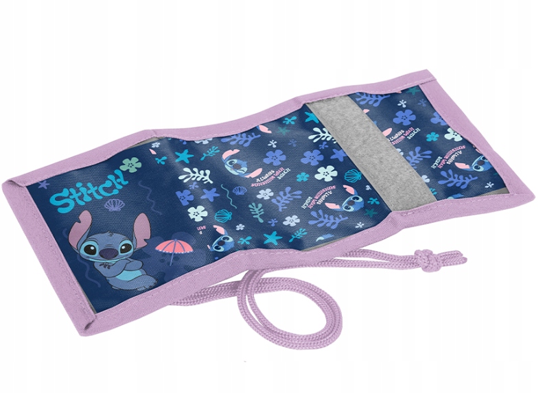 Portfel Stitch – Coastal Cool ze sznurkiem to doskonały wybór dla tych, którzy cenią funkcjonalność i ład. Wnętrze zapewnia wiele użytecznych przegród, które umożliwiają idealną organizację wszystkich akcesoriów. Wewnątrz znajduje się kieszonka na suwak, doskonała do trzymania monet, a także przezroczysta kieszonka na niewielkie fotografie. Szeroka kieszeń na banknoty zajmuje pełną długość portfela po otwarciu, a dodatkowe dwie przegrody idealnie nadają się do przechowywania różnych notatek czy dokumentów. Model ma sznurek, który pozwala na łatwe zawieszenie lub przymocowanie portfela, co zwiększa komfort użycia.