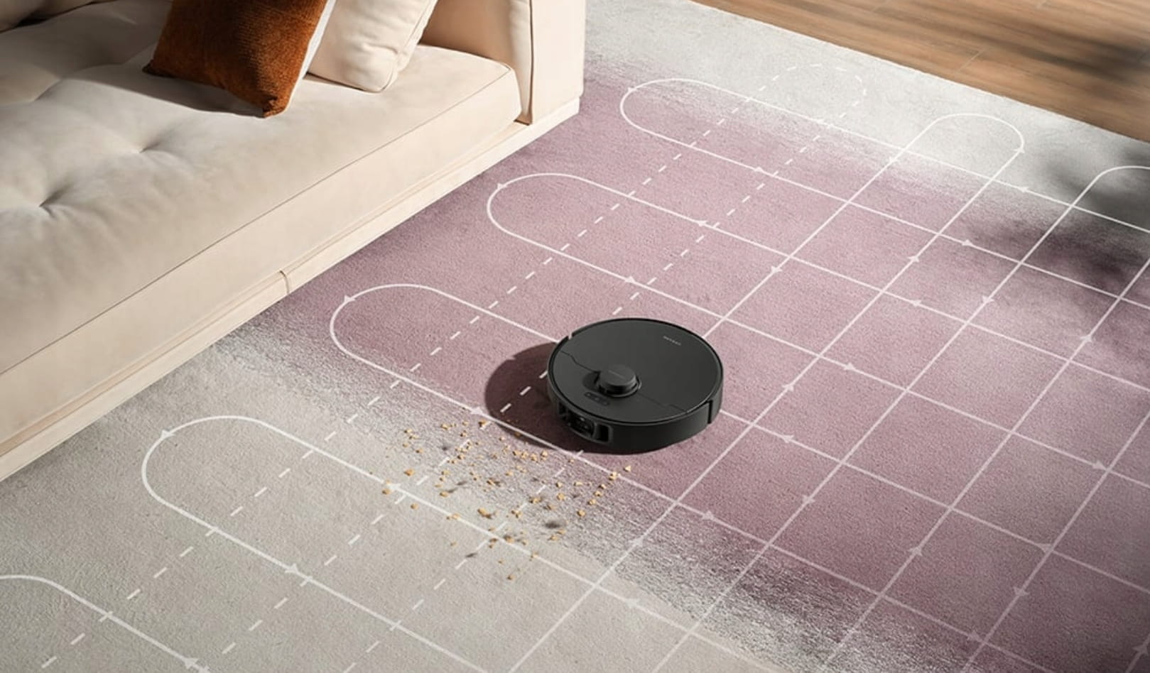 Robot sprzątający rozpoznaje nie tylko to, co znajduje się na podłodze, ale również z jakim typem powierzchni ma do czynienia. Dreame L40s Pro Ultra odróżnia dywany długowłose i krótkowłose, maty do jogi, dywaniki łazienkowe oraz twarde podłogi. Na tej podstawie dostosowuje sposób sprzątania – np. unosi pady do 10,5 mm, aby nie zamoczyć dywanu, lub włącza intensywniejszy tryb czyszczenia. System Smart Dirt Detection 2.0 wykrywa, czy na podłodze znajdują się zabrudzenia suche, takie jak przyprawy, ślady butów czy czekolada lub zabrudzenia płynne, w tym mleko, napoje lub syrop. Na podstawie tego wybiera odpowiednią metodę sprzątania. Po zakończeniu mopowania sprawdzany jest także poziom zabrudzenia padów – jeśli są zbyt brudne, urządzenie wraca do stacji, aby wypłukać je przed kolejnym przejazdem.