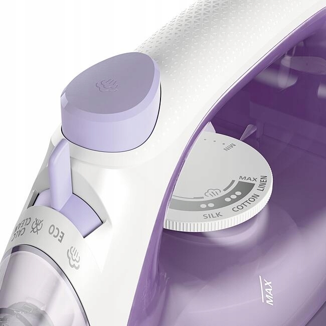 Stopa żelazka firmy Philips jest pokryta specjalną powłoką nieprzywierającą, która umożliwia płynne przesuwanie po wszystkich tekstyliach. Stopa żelazka ma również spiczasty czubek, rowek do prasowania wokół guzików i gładki kształt. Ułatwia ona prasowanie szczególnie trudno dostępnych miejsc, np. wokół guzików i między plisami.Duża pojemność zbiornika na wodę 250 ml sprawia, że nie musisz go tak często napełniać. Za jednym razem możesz wyprasować więcej ubrań.